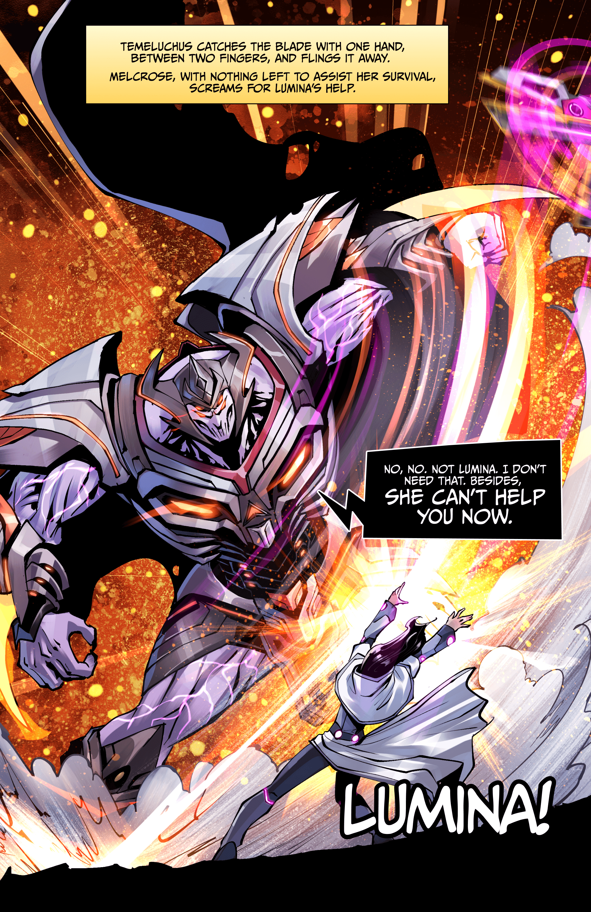 Melcrose, a rogue human prodigy bound to rare Pink Adallium, is a freedom fighter shaped by loss and hunted relentlessly by Temeluchus, the all-powerful emperor of the Gray Alliance.