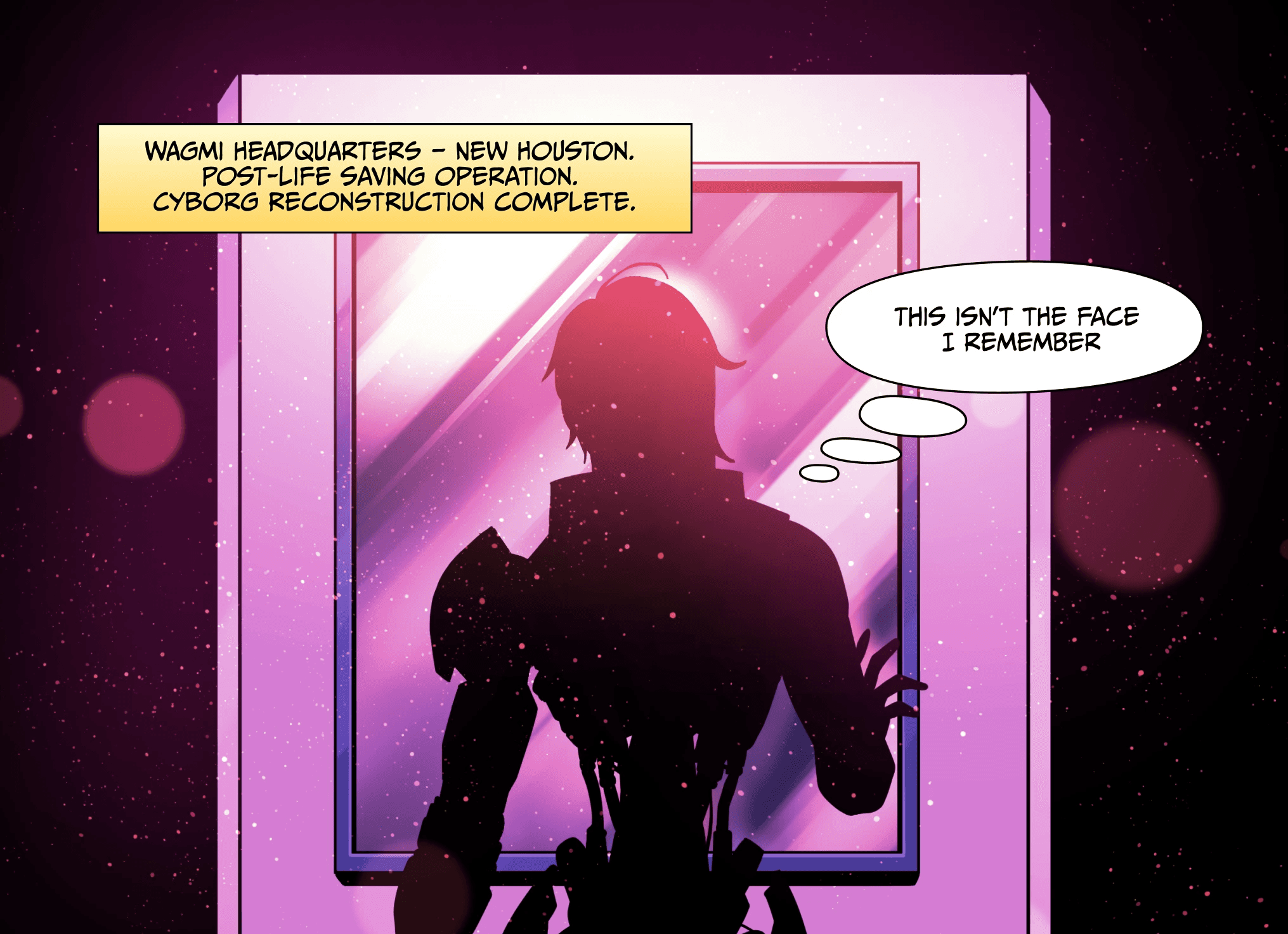 Years later, after a devastating ordeal requires full cybernetic reconstruction, Melcrose stares into the mirror and no longer recognizes the face looking back.